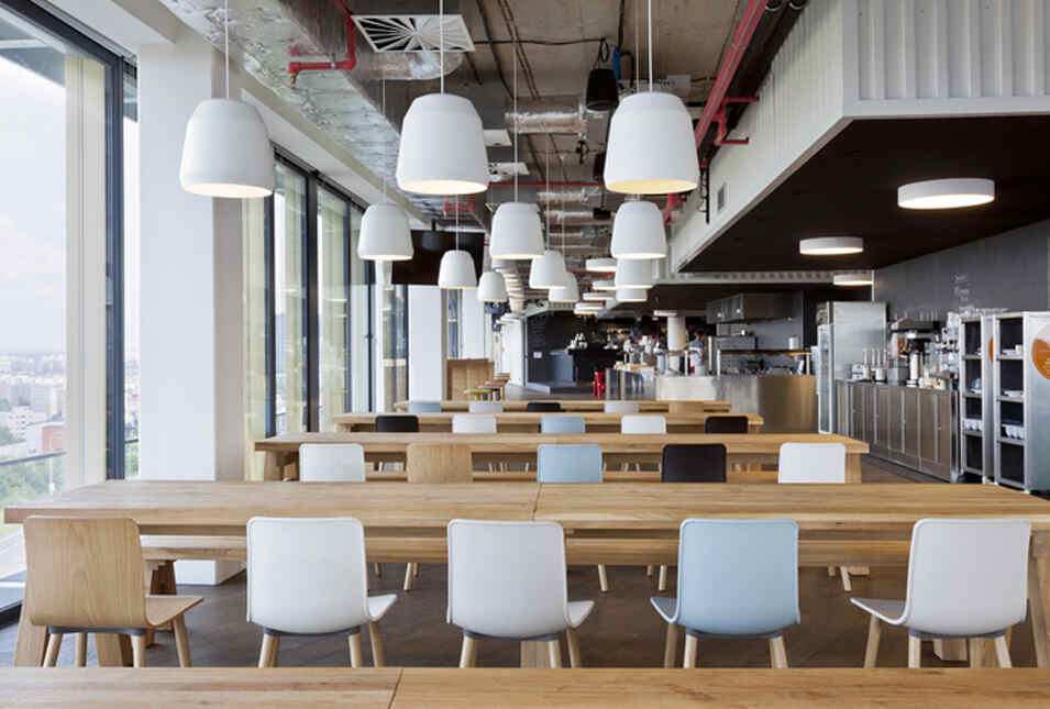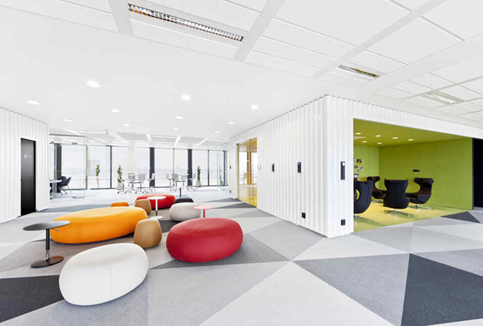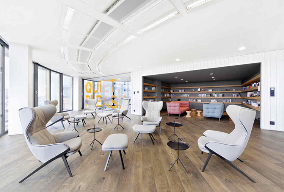 設計介紹:好玩的辦公室,體育館、娛樂室、游戲室、創(chuàng)造放松的空間,石頭型的多彩座椅,更顯趣味性,粉色的沙發(fā)是休息的法寶,并且設置的有圖書館,供人們休息室查閱,軟裝的座椅舒適,實用,還有用餐區(qū),木質的座椅更加安全,健康,照片墻以綠色為背景顯得清晰明了,人性化,設計了體育館,員工們健身娛樂。