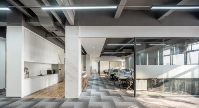 2、協(xié)作與可持續(xù)理念相結(jié)合的開(kāi)放式辦公室設(shè)計(jì):天花設(shè)計(jì)富有特色,由白色穿孔金屬板彎折出具“通風(fēng)”功能的裝飾吊頂。光澤的金屬質(zhì)感與粗獷的黑色原始建筑頂面形成強(qiáng)烈的視覺(jué)反差。新舊的對(duì)比、色彩的對(duì)比、質(zhì)感的對(duì)比、簡(jiǎn)練的設(shè)計(jì)結(jié)合當(dāng)下潮流靈動(dòng)辦公理念,成功塑造出一個(gè)具專(zhuān)業(yè)氣質(zhì)的時(shí)尚辦公空間。