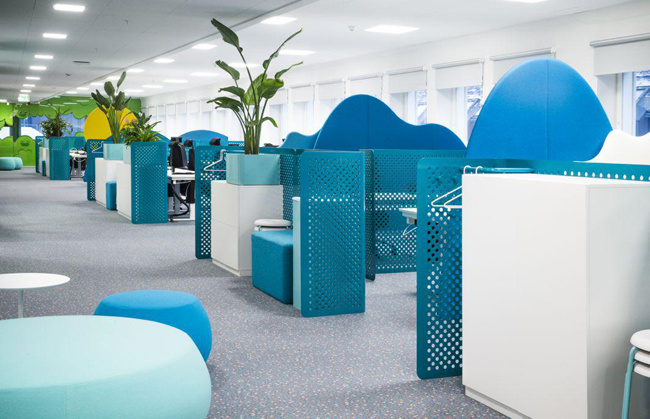 4、動漫公司辦公室裝修:以一個開放式的辦公環(huán)境為宗旨,旨在培養(yǎng)員工的團隊協(xié)作能力和溝通能力,而隨處可見的沙發(fā)座椅大大方便了員工之間的溝通交流。放松心情的辦公氛圍也使得靈感隨時都有可能迸發(fā),公司員工能夠享受到以任何自己喜歡的方式進行靈感的創(chuàng)作。除了主要的工作區(qū)域,辦公室的其他功能區(qū)也各具特色。以天然綠色為背景的圖書館能夠為員工提供寧靜安逸的閱讀空間,另外還有包括蹦床、球類等讓員工可以盡情玩樂游戲室,閑暇之余聊天放松的咖啡廳。而餐廳的設(shè)計有吸引力,將餐廳設(shè)計成一個復(fù)古的美式游樂園,搖椅或旋轉(zhuǎn)木馬般的座位,極具童心童趣。