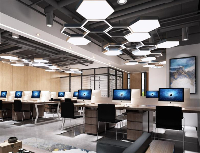 3、整體空間以現(xiàn)代科技感為主,運(yùn)用線條燈來營(yíng)造空間的整體氛圍,提升科技感的體驗(yàn),在局部用活躍的顏色來跳動(dòng)整個(gè)空間的色彩,形成不一樣的風(fēng)格。會(huì)議室設(shè)計(jì)裝修使用簡(jiǎn)潔明了的軟膜天花,給予整個(gè)空間的光線之外,形成了自己獨(dú)特的裝飾作用。員工辦公室設(shè)計(jì)用六邊形的蜂巢燈具來打亂整個(gè)空間的死板性,讓整個(gè)空間更具有創(chuàng)新力。