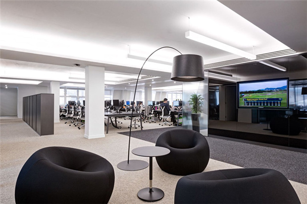 4、某知名品牌投資管理公司辦公室裝修:開放辦公區(qū)域作為整體員工工作區(qū)域,保證員工舒適性,提高工作效率,天花黑格吊頂,天花用暖色的燈裝飾,地面沒有過多的造型,整體營造的氛圍很和諧。辦公室休閑區(qū)設(shè)計(jì):明朗的色調(diào),具有開放式的格局,員工置身于靈動的環(huán)境下,思維打開,工作效率極高。